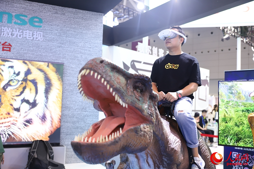 戴上VR設備,進入“侏羅紀時代”。人民網(wǎng) 劉森君攝