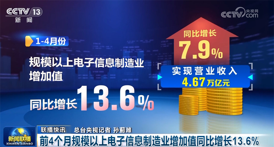 前4個(gè)月規(guī)模以上電子信息制造業(yè)增加值同比增長13.6%