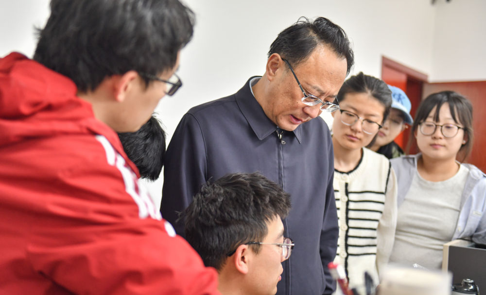 5月30日,尼瑪扎西(中)和他的學(xué)生一起討論藏漢實(shí)時(shí)翻譯小程序運(yùn)行問(wèn)題。新華社記者 晉美多吉 攝