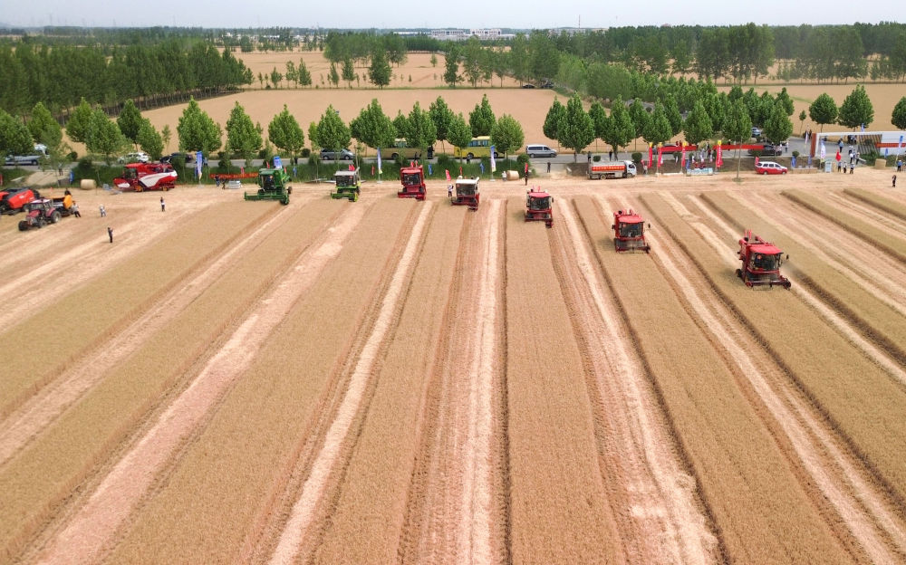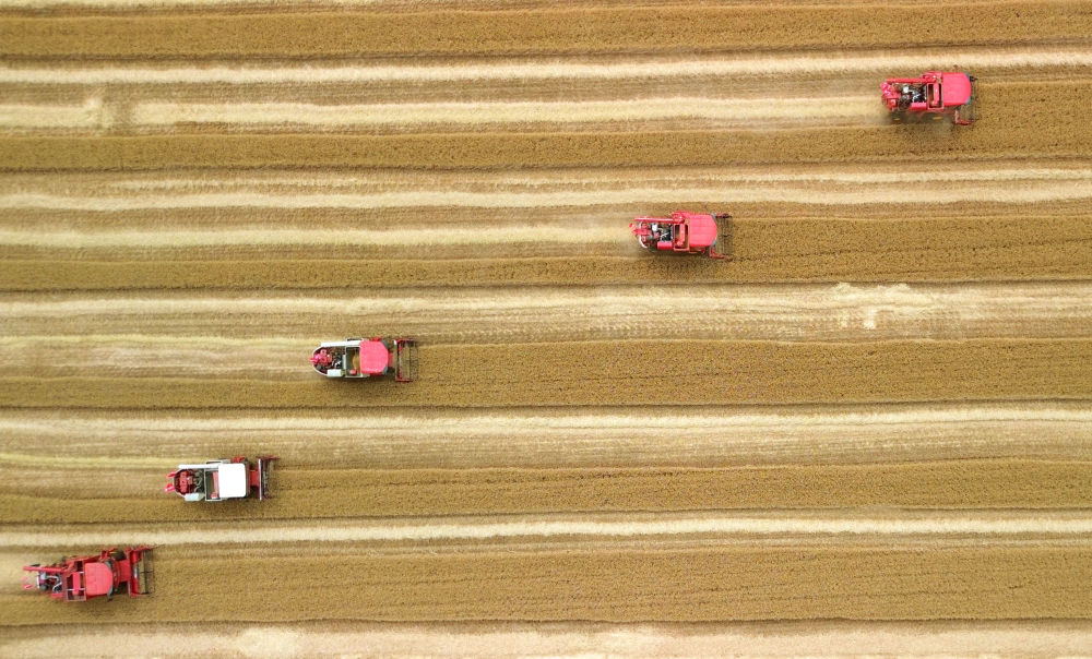麥浪翻滾,沃野生金。麥田中,10臺收割機依次排開;一聲令下,農(nóng)機手駕駛收割機勻速前行,風(fēng)中搖曳的麥穗被吸入“腹中”,田間只剩下短短的麥茬。