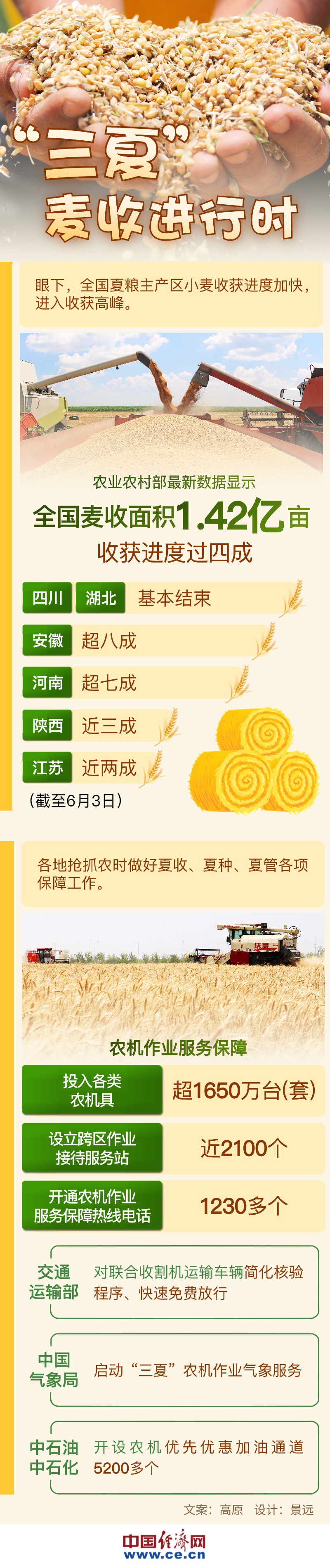 進入六月,全國“三夏”大規(guī)模小麥機收工作全面展開,收獲進度加快。據(jù)農(nóng)業(yè)農(nóng)村部最新數(shù)據(jù)顯示,截至6月3日,全國麥?zhǔn)彰娣e1.42億畝,收獲進度過四成。