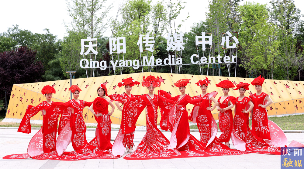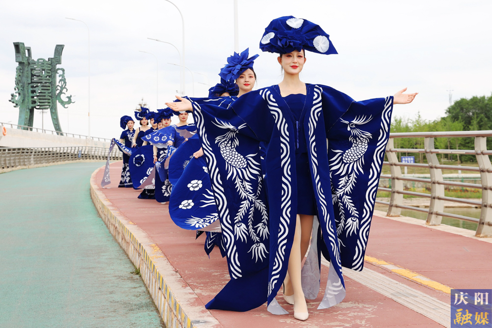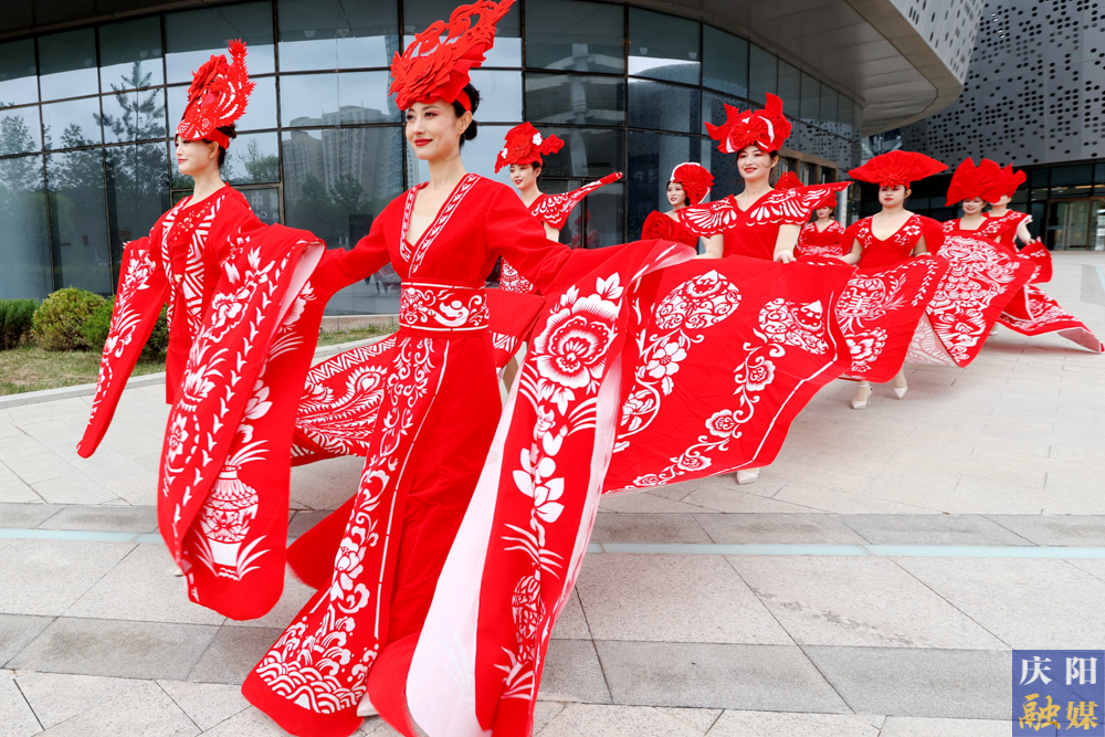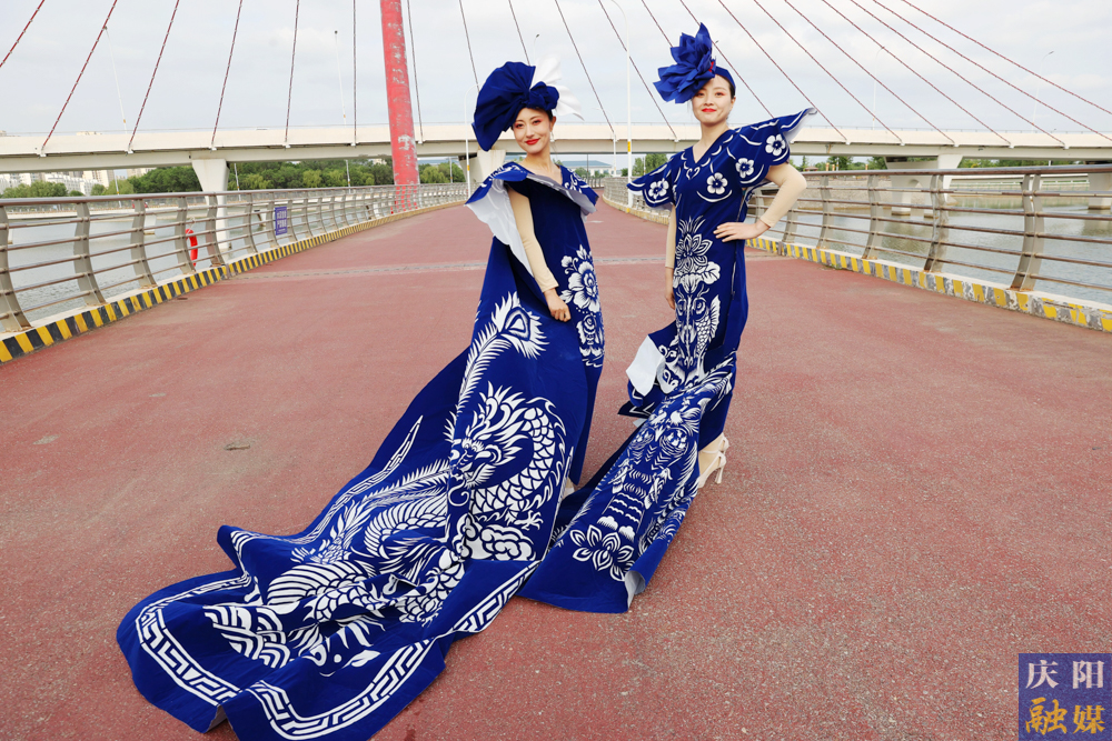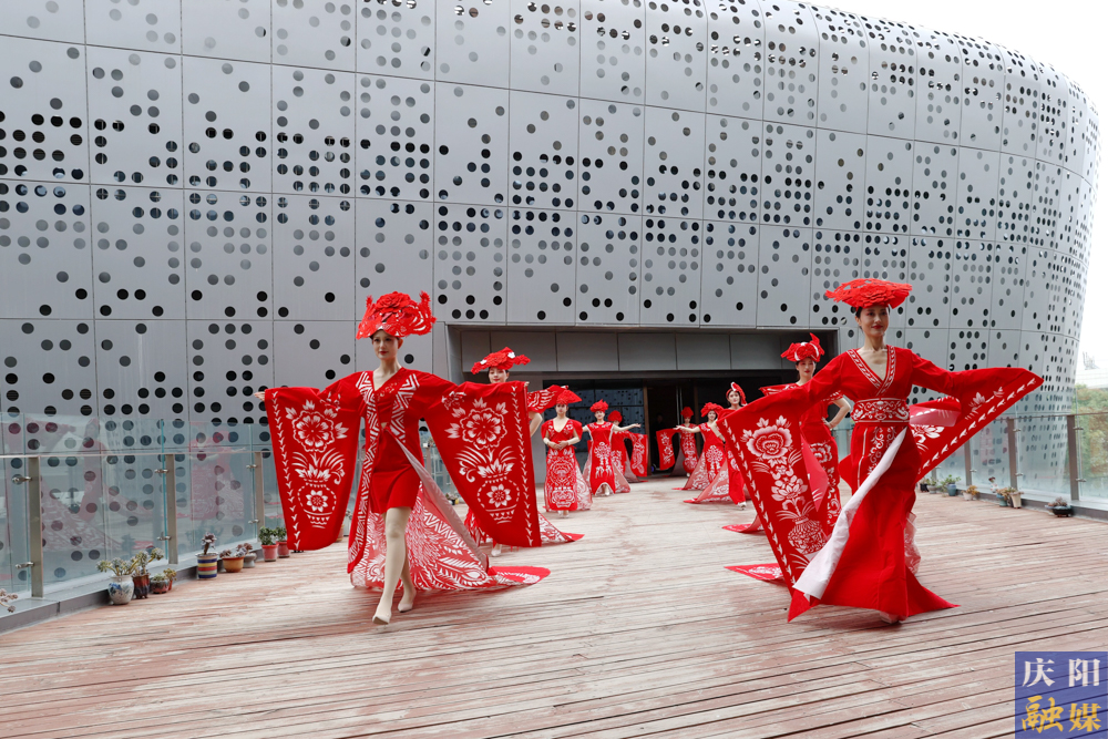 主播們身著刻鏤龍紋、鳳紋、抓髻娃娃、生命樹、魚鉆蓮、牡丹等剪紙紋樣,大V領(lǐng)、魚尾裙、聳肩收腰的“剪云裳”剪紙服裝,行走在傳媒大廈、西峰區(qū)彩虹橋、慶陽(yáng)市城市海綿運(yùn)動(dòng)綠地等處,全方位、多角度地展示了剪紙服裝的特色與魅力。