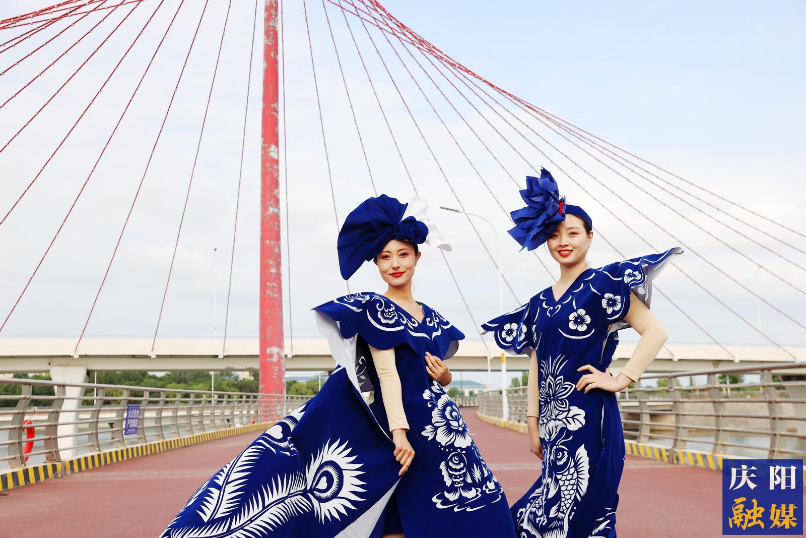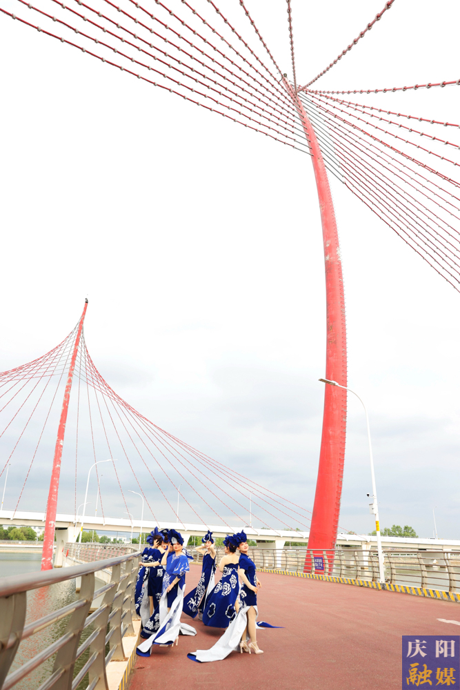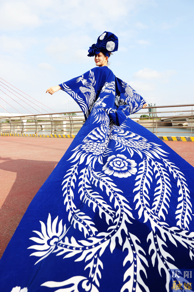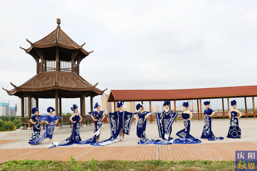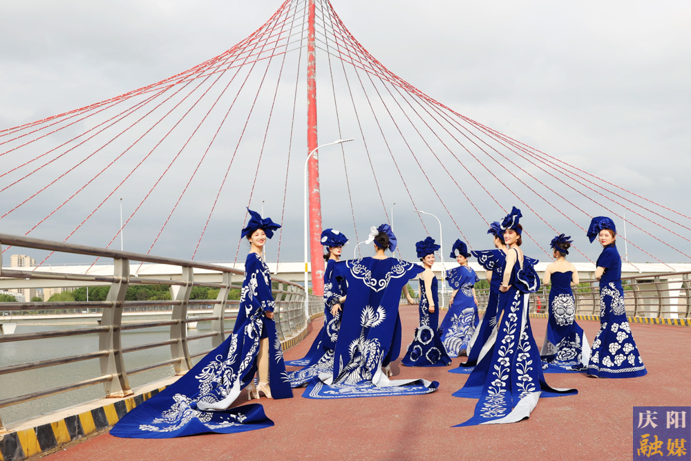 主播們身著刻鏤龍紋、鳳紋、抓髻娃娃、生命樹、魚鉆蓮、牡丹等剪紙紋樣,大V領(lǐng)、魚尾裙、聳肩收腰的“剪云裳”剪紙服裝,行走在傳媒大廈、西峰區(qū)彩虹橋、慶陽(yáng)市城市海綿運(yùn)動(dòng)綠地等處,全方位、多角度地展示了剪紙服裝的特色與魅力。