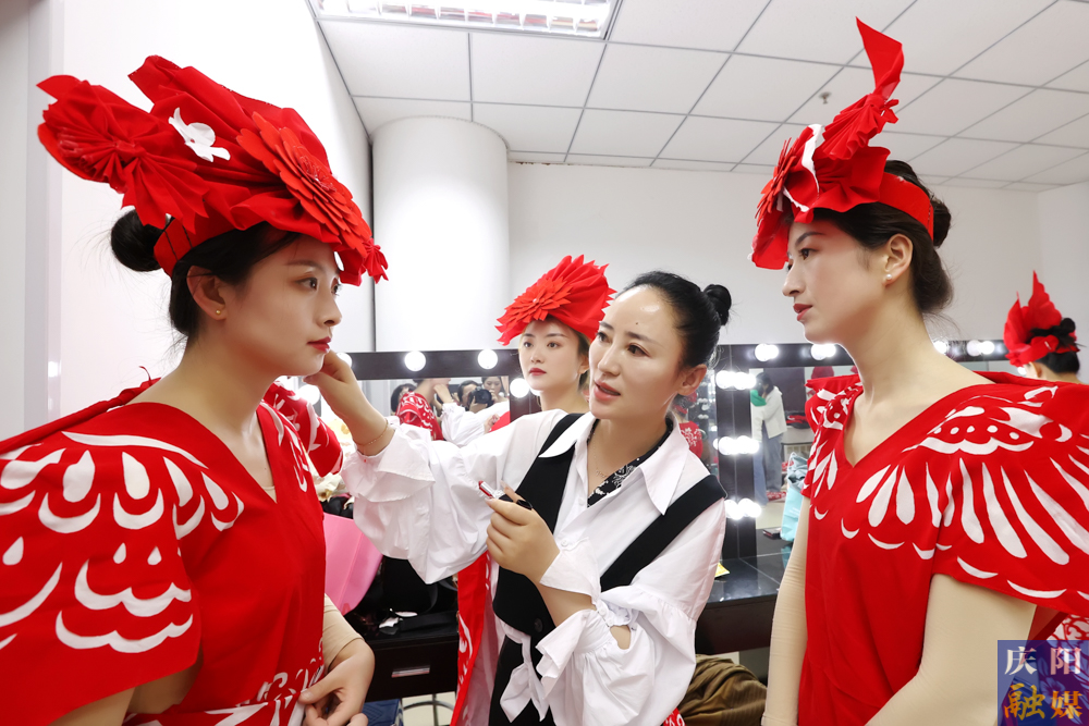 鎮(zhèn)原縣文化館館長(zhǎng)、“剪云裳”慶陽(yáng)剪紙系列服裝設(shè)計(jì)者常燕為模特打理造型。