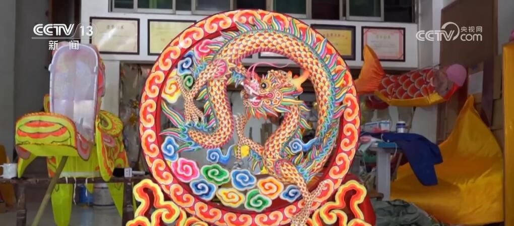 這件精美的龍燈彩扎藝術(shù)品,名叫《飛龍?jiān)谔臁?,是由非遺傳承人周合平歷時(shí)3個(gè)月完成的,馬上就要送往北京,收藏在中國非物質(zhì)文化遺產(chǎn)館。在這間扎龍工作室里,記者看到,大家正在趕制一批表演用的龍燈。
