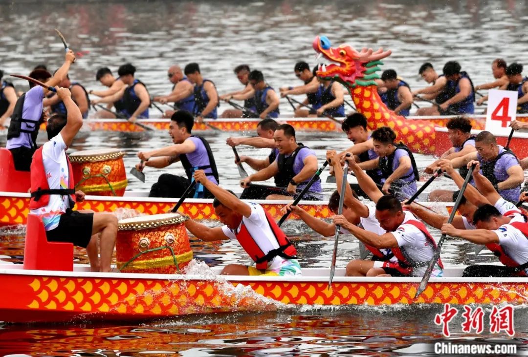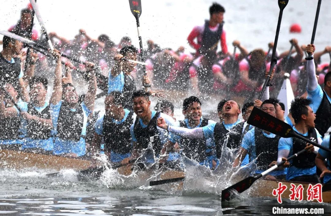 伴隨著鏗鏘有力的鼓聲,龍舟劈波斬浪,上演速度與激情。中新社記者 張斌 攝