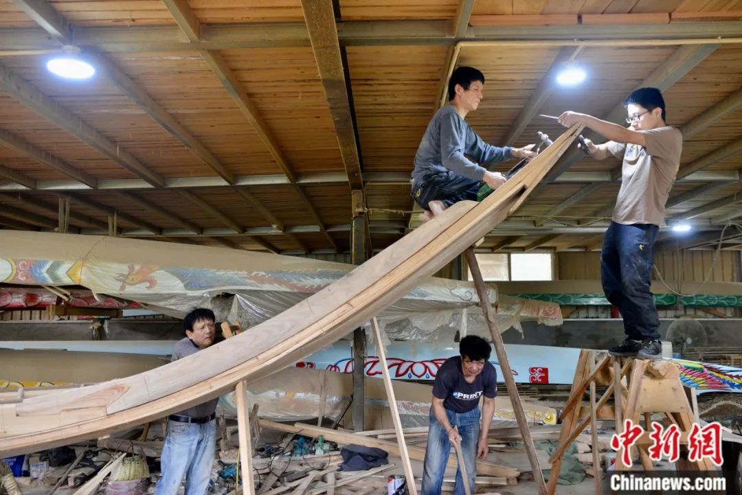“龍舟世家”方忠雄龍舟廠畫花師傅在對龍舟“化妝”。一條龍舟基本是船頭和船身畫蓮花、壽桃、鯉魚等,寓意吉祥如意。在船尾,則是畫龍、鳳、鷹等靈禽猛獸,寓意霸氣威武。中新社記者 張斌 攝