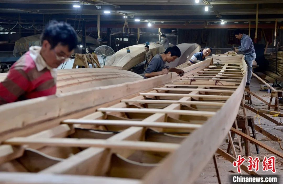 龍舟廠內(nèi),造船師傅們各顯神功,刀起錘落,在木花四濺中,傳承著龍舟傳統(tǒng)手工制作技藝。中新社記者 張斌 攝