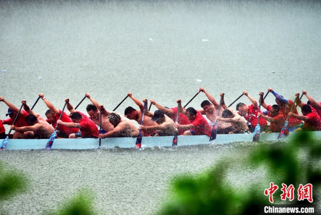 福州連江海上龍舟賽上,市民冒雨劃龍舟。中新社記者 張斌 攝