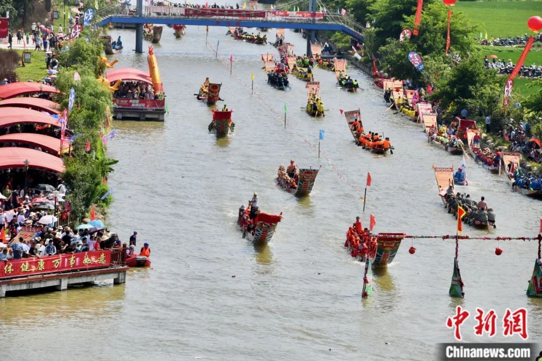 2023年6月12日,莆田市“爬龍船”民俗賽事活動啟動儀式暨百艘龍舟齊聚黃石華江競渡盛會拉開帷幕。鑼鼓聲中,“龍船”齊發(fā),百舸爭流,岸上民眾歡呼聲不斷。中新社記者 吳晟煒