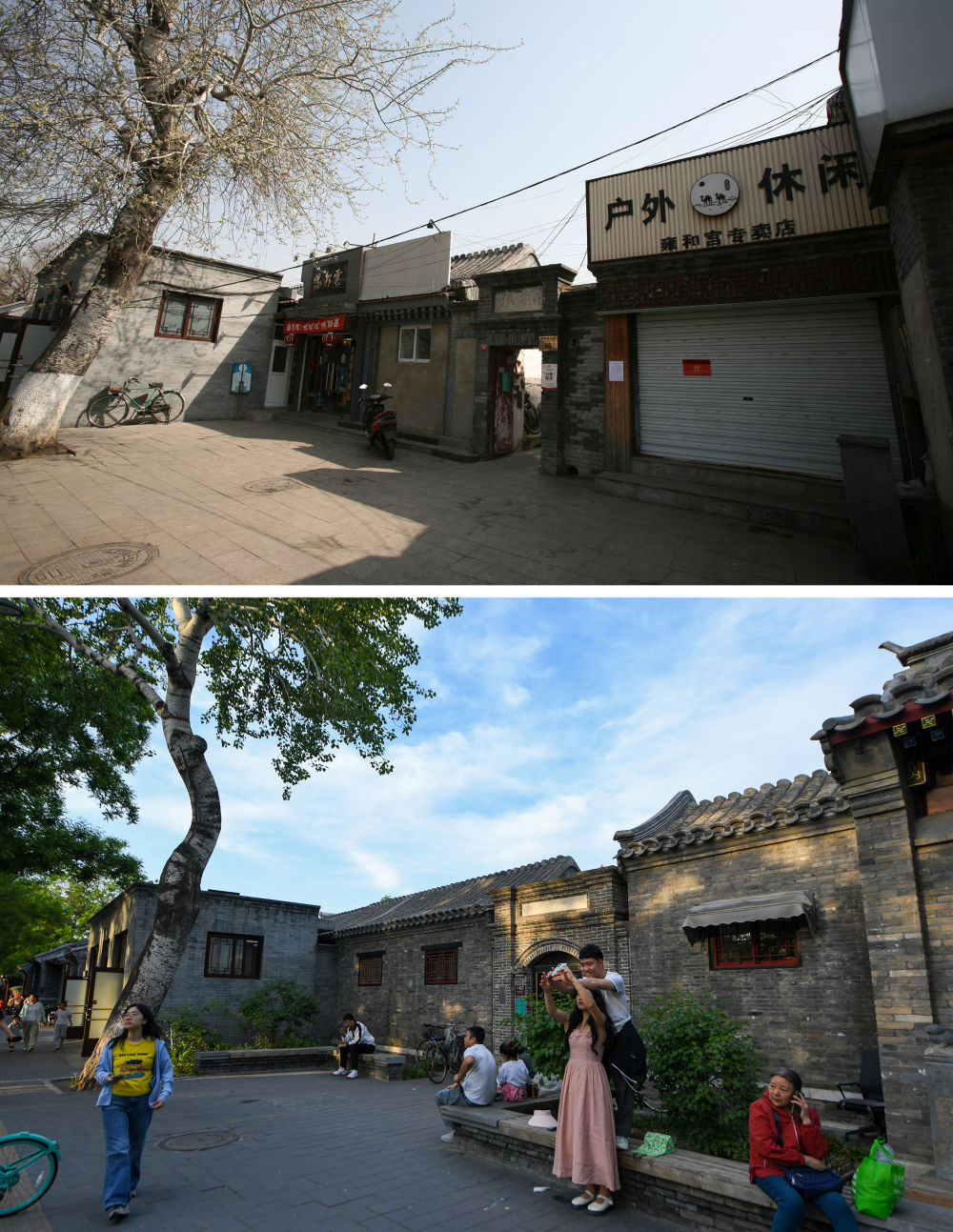 拼版照片:上圖為2018年6月8日拍攝的北京雍和宮大街40號(資料照片);下圖為2024年5月11日拍攝的改造后的同一地點(新華社記者鞠煥宗攝)。新華社發(fā)