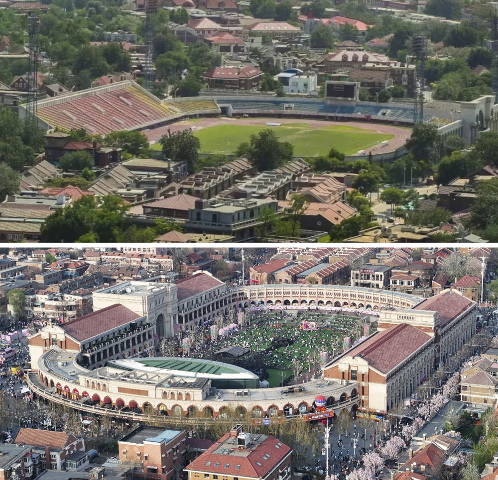 拼版照片:上圖是位于天津五大道的民園體育場(資料照片);下圖是2024年4月6日拍攝的民園廣場(新華社記者趙子碩攝)。民園廣場的前身是始建于1920年的民園體育場,曾是中國的第一個燈光足球場。經(jīng)過提升改造,現(xiàn)在的民園廣場已經(jīng)成為中西合璧的“城市會客廳”。新華社發(fā)