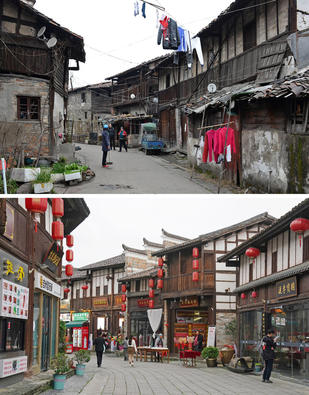拼版照片:上圖為撫州文昌里歷史文化街區(qū)三角巷修繕前的樣貌(資料照片);下圖為同一地點修繕后的街景(2024年4月9日新華社記者萬象攝)。新華社發(fā)