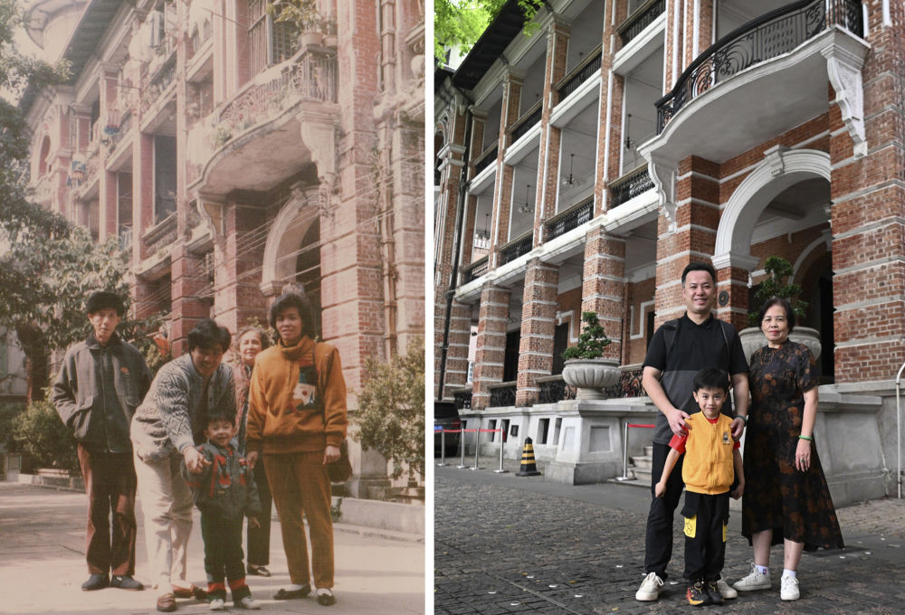 杜煜杰手拿一張老照片,攜母親和兒子重回廣州荔灣區(qū)沙面大街舊居樓前,30多年后再拍合影時,回憶瞬間涌上心頭:“我清楚地記得當(dāng)時全家人要去廣州文化公園觀賞菊展,出發(fā)前,我們拍下了這張彩色合照?!?/p>