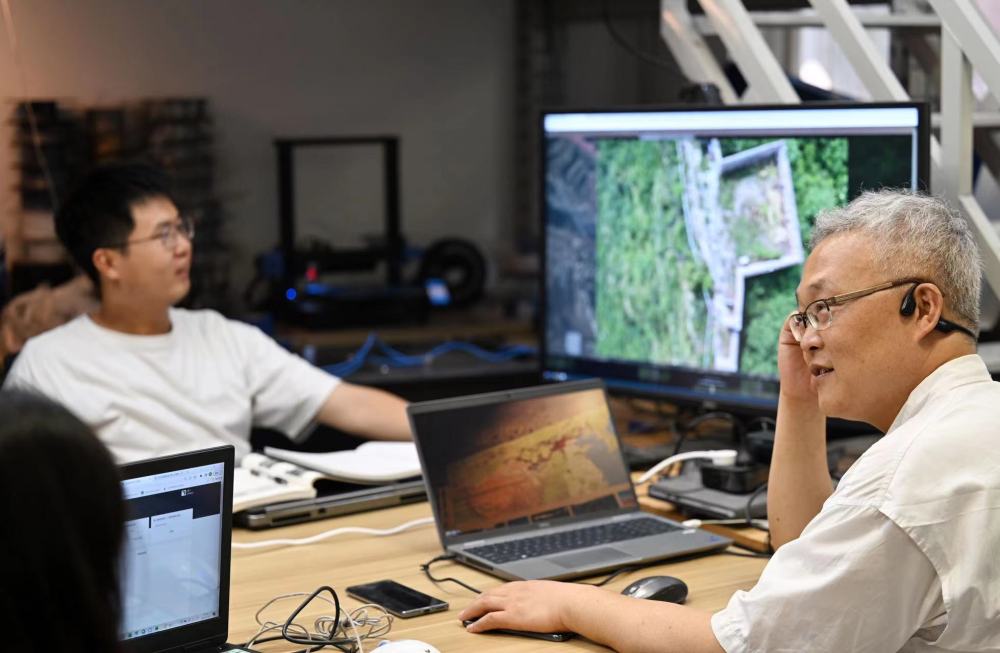 天津大學(xué)建筑學(xué)院教授李哲(右)和學(xué)生在工作室內(nèi)就拍攝的長城圖像進行交流。新華社記者李然 攝