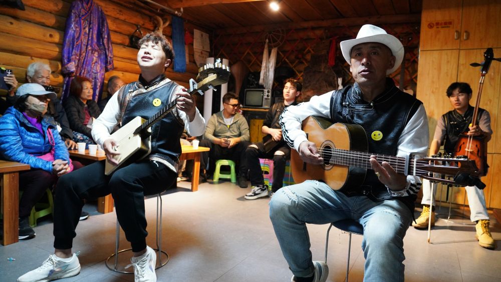 6月2日,在新疆喀納斯景區(qū)家訪點(diǎn),樂隊(duì)歌手為游客演唱。新華社記者 阿曼 攝