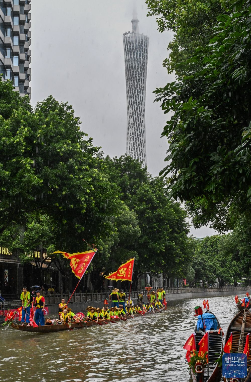 6月10日,獵德村熱鬧的傳統(tǒng)龍舟“龍船景”與繁忙的現(xiàn)代都市交匯相融(無(wú)人機(jī)照片)?!褒埓啊笔菑V府地區(qū)水鄉(xiāng)在端午期間舉辦的一種民俗活動(dòng)。新華社記者 劉大偉 攝