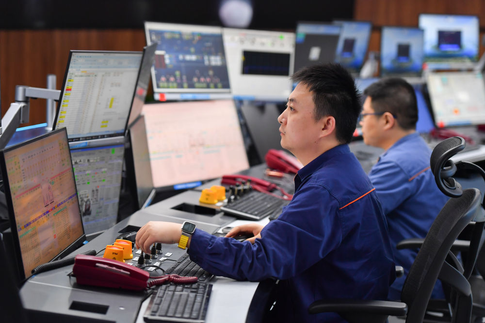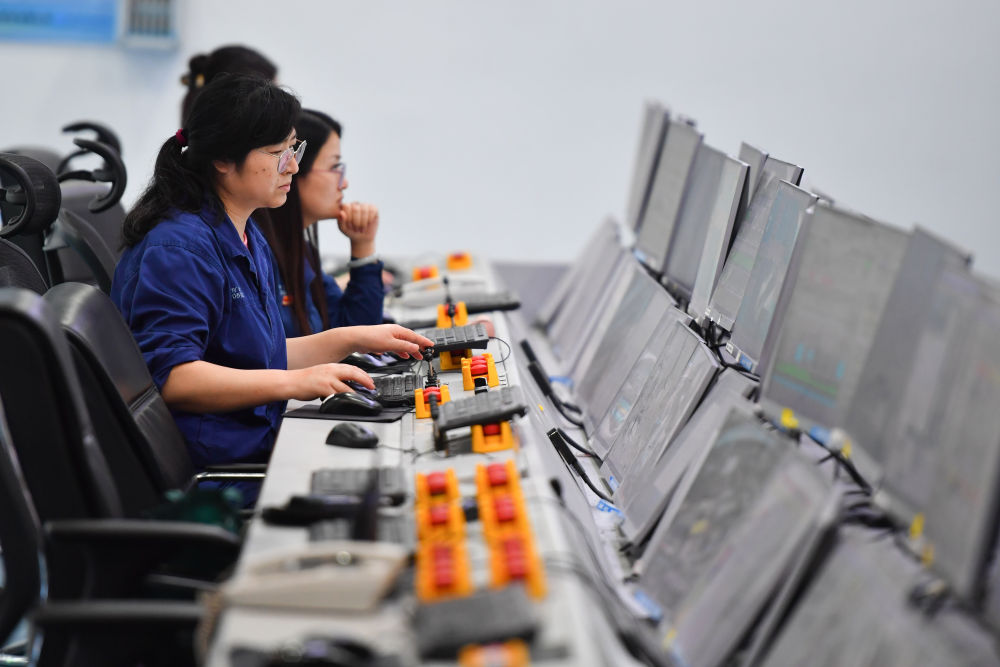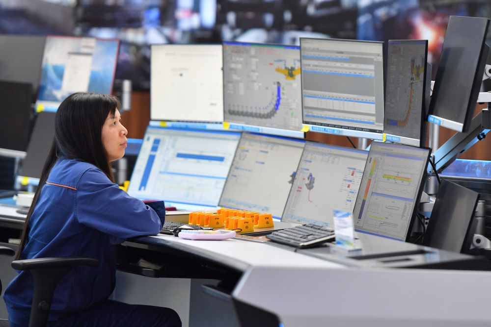 2024年6月13日,在位于湖南省湘潭市的湘潭鋼鐵集團(tuán)有限公司五米寬厚板廠智慧中心,工作人員在遠(yuǎn)程操作加熱爐設(shè)備。五米寬厚板廠智慧中心利用超融合、虛擬化、5G傳輸以及分布式計(jì)算和存儲(chǔ)等技術(shù),將五米板煉鋼、軋鋼和熱處理全工序的控制和二級(jí)、三級(jí)系統(tǒng)進(jìn)行整合,改善工人的工作環(huán)境,提高生產(chǎn)的自動(dòng)化程度和效率。新華社記者 陳澤國(guó) 攝