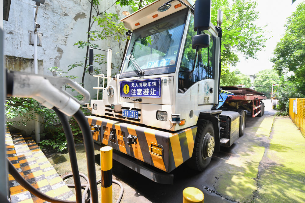2024年6月13日,在湖南省湘潭市,一臺(tái)碼頭無人牽引車??吭谙嫣朵撹F集團(tuán)有限公司的充電站。碼頭無人牽引車?yán)?G通信和北斗定位技術(shù),結(jié)合激光雷達(dá)和相機(jī)等傳感器對(duì)周圍的環(huán)境進(jìn)行動(dòng)態(tài)的高精度建模,實(shí)時(shí)獲取牽引車與掛車的相對(duì)位置信息和環(huán)境信息。 新華社記者 陳澤國(guó) 攝