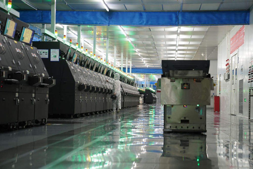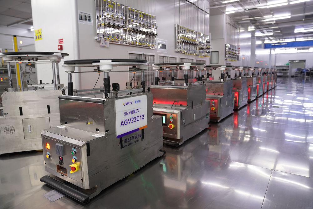 2024年6月4日,在位于江西省南昌市高新區(qū)的江西兆馳半導(dǎo)體有限公司外延車間,AGV自動(dòng)轉(zhuǎn)運(yùn)小車在5G技術(shù)支持下進(jìn)行自動(dòng)搬運(yùn)。 新華社記者 周密 攝