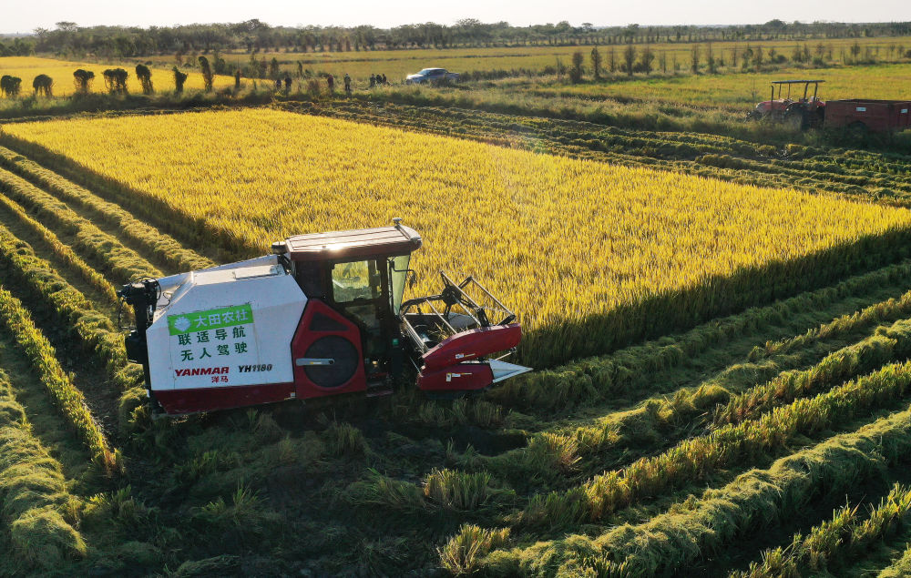 2022年10月11日,在江西省南昌縣大田農(nóng)社,無人駕駛收割機(jī)在收割成熟的水稻。無人駕駛收割機(jī)裝有精準(zhǔn)導(dǎo)航系統(tǒng),提高了收獲精度,降低了糧食損耗。 新華社記者 萬象 攝