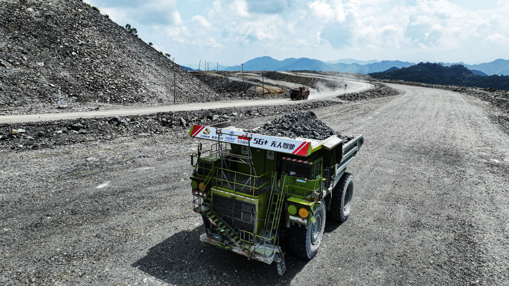 這是江銅集團(tuán)德興銅礦5G智能采礦運(yùn)輸作業(yè)場(chǎng)景(2023年8月24日攝)。電動(dòng)輪汽車使用“5G+無人駕駛”技術(shù)實(shí)現(xiàn)礦山運(yùn)輸生產(chǎn)裝、運(yùn)、卸全流程作業(yè)過程無人自主運(yùn)行。 新華社發(fā) (張偉峰 攝)