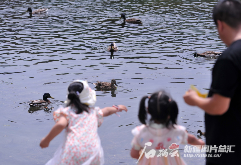 △6月15日,烏魯木齊市民在水磨溝區(qū)水磨河濱河景觀(guān)帶喂鴨子。古爾邦節(jié)假期,許多市民選擇在家門(mén)口“微度假”模式,悠享慢時(shí)光。石榴云/新疆日?qǐng)?bào)記者 秦梅花攝