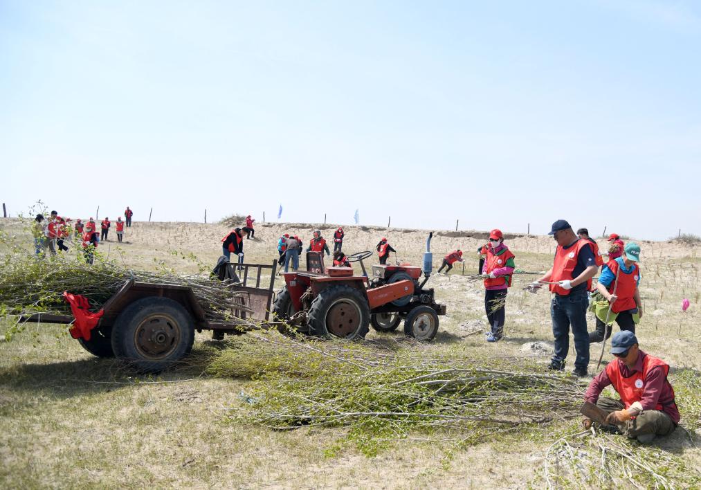 2024年5月6日,在地處渾善達(dá)克沙地的內(nèi)蒙古錫林郭勒盟正藍(lán)旗寶紹岱蘇木扎魯特嘎查,志愿者們開(kāi)展植綠活動(dòng)。新華社發(fā)(巴依斯古楞 攝)