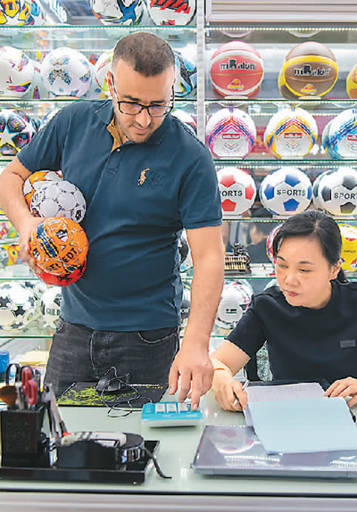 近期,體育賽事相關(guān)商品熱度持續(xù)攀升。在浙江金華義烏國(guó)際商貿(mào)城,各種體育用品、飾品、戶外產(chǎn)品等吸引了不少海內(nèi)外客商下單。圖為外商在選購(gòu)體育用品。