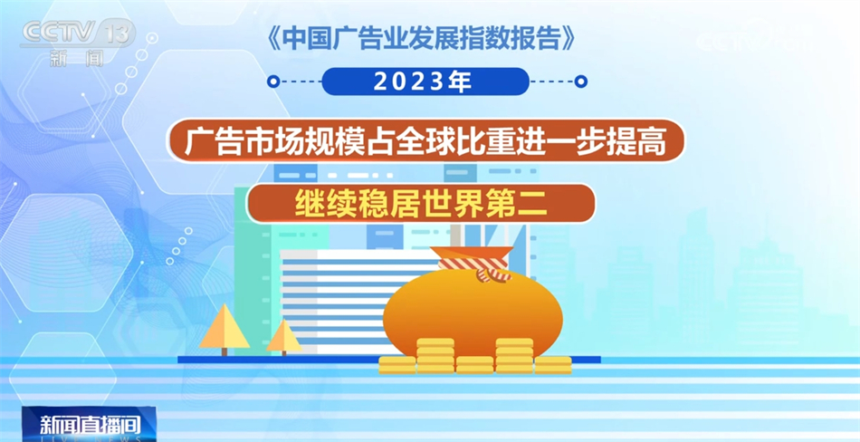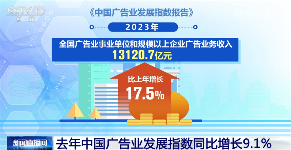 《中國廣告業(yè)發(fā)展指數(shù)報告》顯示,我國廣告業(yè)規(guī)模快速提升,產(chǎn)業(yè)活力不斷釋放。2023年,全國廣告業(yè)事業(yè)單位和規(guī)模以上企業(yè)廣告業(yè)務(wù)收入13120.7億元,比上年增長17.5%,廣告市場規(guī)模占全球比重進(jìn)一步提高,繼續(xù)穩(wěn)居世界第二。