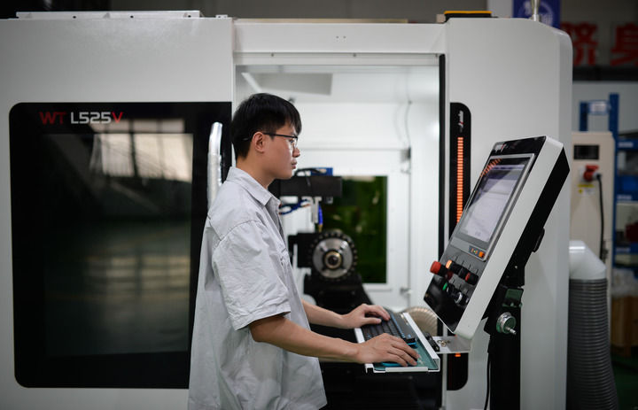 員工在位于廣東省佛山市的原點(diǎn)智能技術(shù)有限公司車(chē)間操作數(shù)控機(jī)床(5月16日攝)。新華社記者 李任滋 攝
