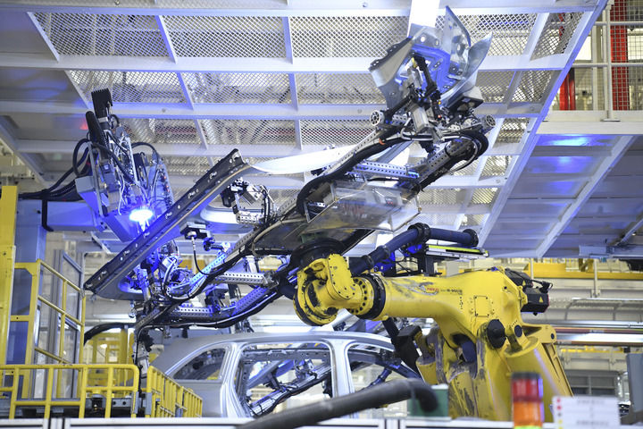 江蘇常州理想汽車(chē)智能制造基地焊裝車(chē)間的機(jī)械臂正在作業(yè)(5月31日攝)。新華社記者 柳文惠 攝