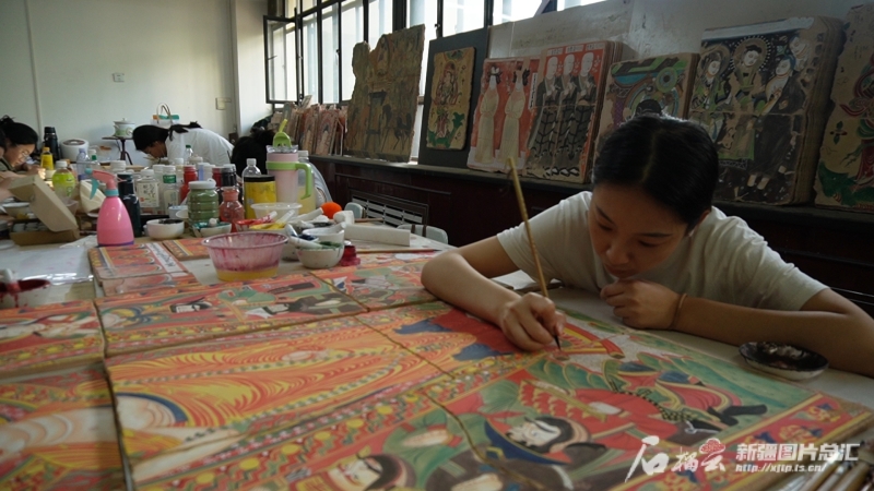 烏魯木齊職業(yè)大學(xué)學(xué)生在制作龜茲壁畫復(fù)原作品。石榴云/新疆日?qǐng)?bào) 記者宋海波攝