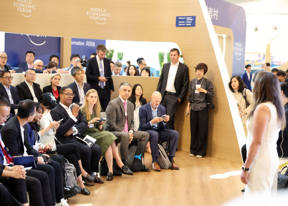 6月26日,在夏季達沃斯論壇主會場大連國際會議中心,嘉賓交流討論。新華社記者李鋼攝
