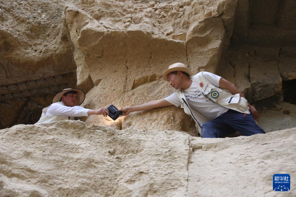6月15日,在阿富汗巴米揚省的弗拉迪石窟遺址區(qū),中國學者邵學成(左)與當?shù)毓ぷ魅藛T一同進行考古工作。新華社發(fā)(塞夫拉赫曼·薩菲攝)