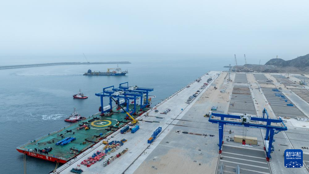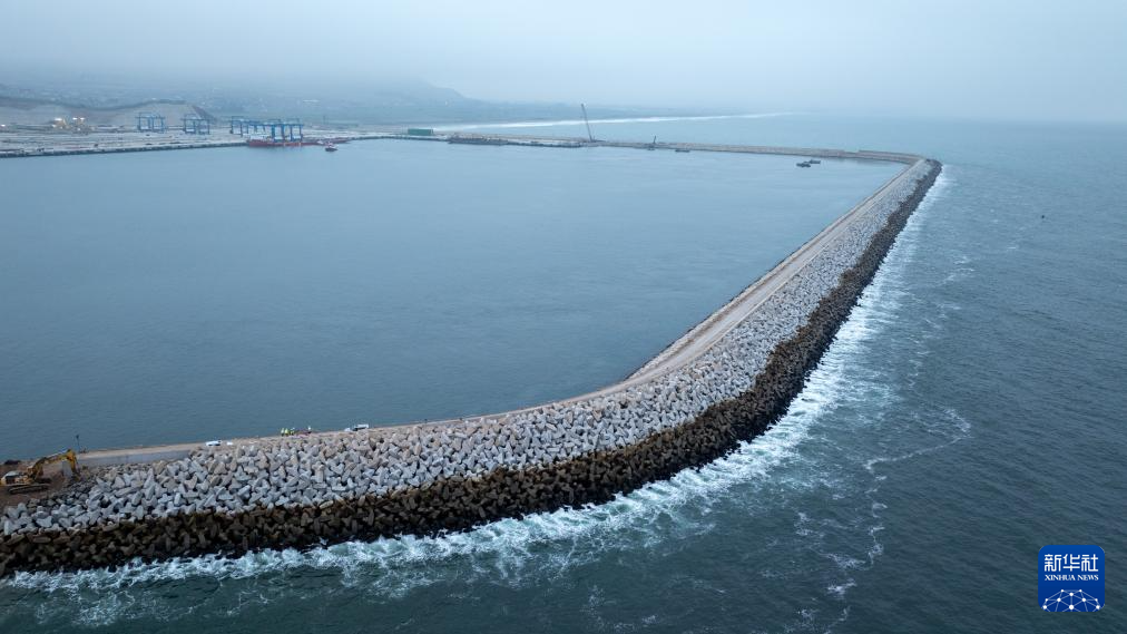 由中企控股和投資開發(fā)的錢凱港位于秘魯首都利馬以北的錢凱灣內(nèi)。從空中俯瞰,約2.6公里長的防波堤像巨臂一般環(huán)抱住碼頭設(shè)施,以阻擋太平洋海浪的侵蝕。