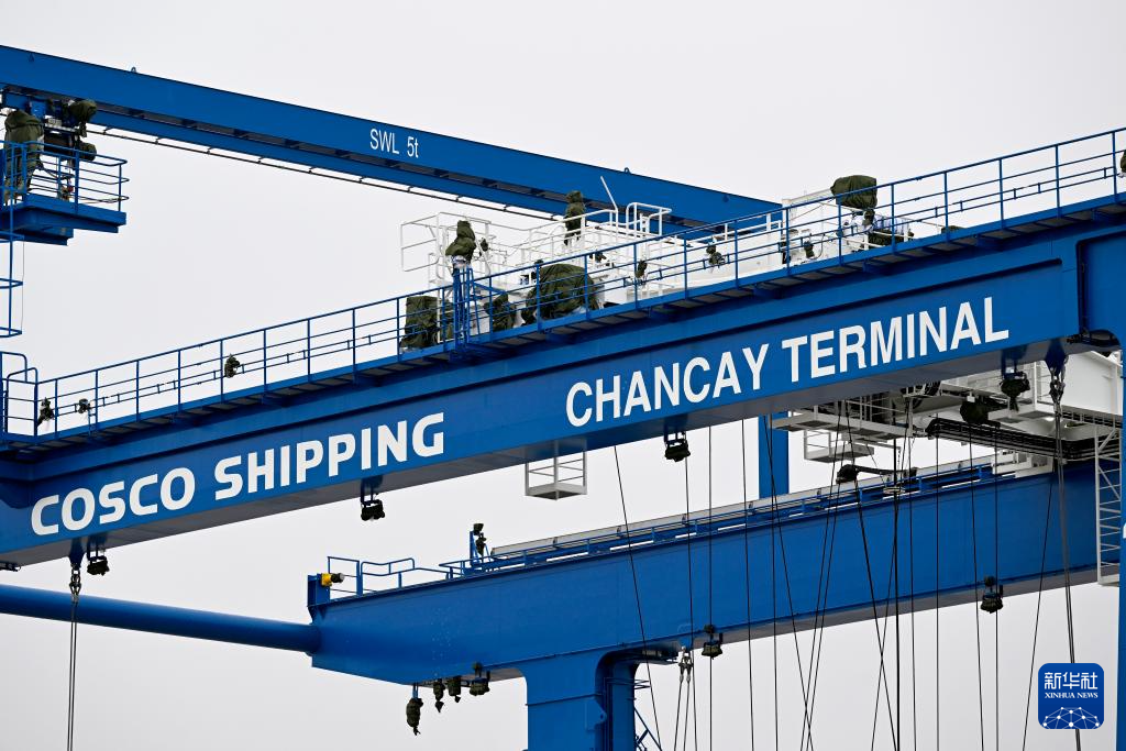 6月27日,岸邊集裝箱起重機(jī)和軌道吊運(yùn)抵秘魯錢凱港。 新華社發(fā)(上海振華重工供圖)