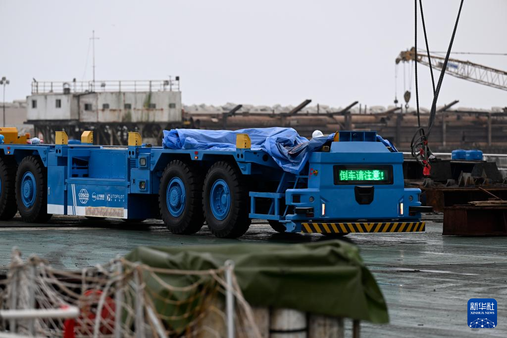 這是6月21日在秘魯錢凱港碼頭操作區(qū)拍攝的具備自動駕駛技術(shù)的電動集裝箱卡車。 新華社記者 李木子 攝