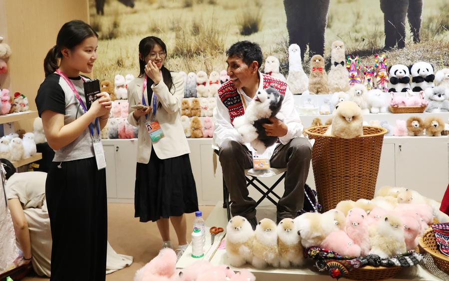 馬馬尼大叔在上海進(jìn)博會(huì)“溫暖駝”品牌展臺(tái)內(nèi)向一名參觀者展示剛制作完成的羊駝玩偶(2023年11月5日攝)。新華社記者 方喆 攝
