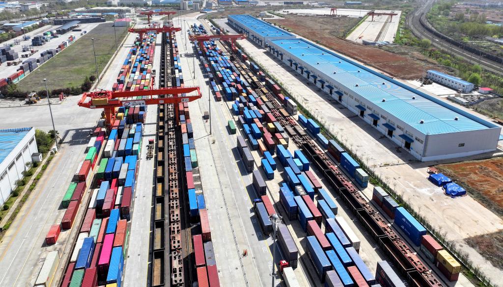 這是2024年4月15日拍攝的位于山東省青島市的上合示范區(qū)多式聯(lián)運(yùn)中心(無人機(jī)照片)。圖片來源:新華社