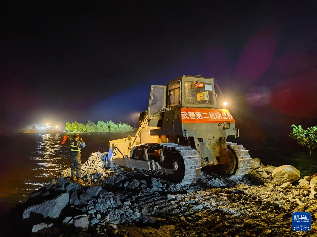 已是7日凌晨三點,武警第二機(jī)動總隊二級上士李貴權(quán)左手揮著紅色指揮旗,右手握著手電,指揮推土機(jī)把一塊塊大石料推進(jìn)決口處。