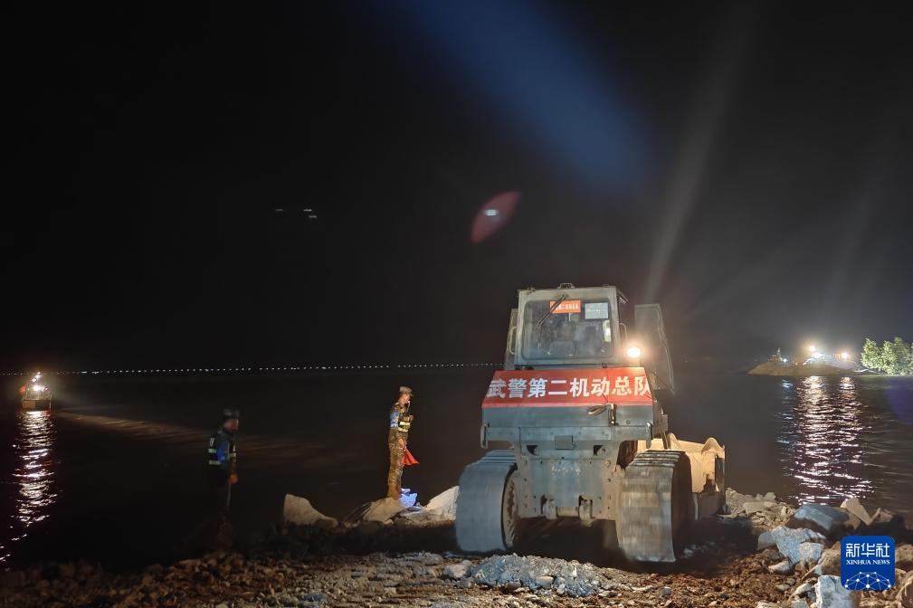 7月7日凌晨,在湖南省岳陽市華容縣團(tuán)洲垸洞庭湖一線堤防決口處,武警部隊官兵出動照明車為施工現(xiàn)場提供照明。新華社記者 李秉宣 攝