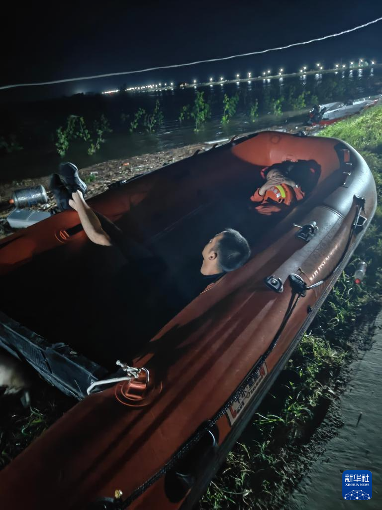 7月7日凌晨,在湖南省岳陽市華容縣團(tuán)洲垸洞庭湖一線堤防決口處,隨時待命的搶險救援人員在橡皮艇里小憩。新華社記者 黎云 攝