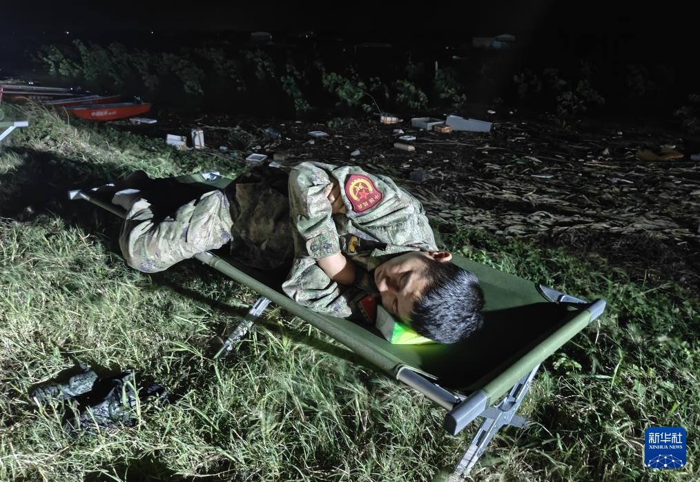 7月7日凌晨,在湖南省岳陽市華容縣團(tuán)洲垸洞庭湖一線堤防決口處,隨時待命的民兵突擊隊員合衣小憩。新華社記者 黎云 攝