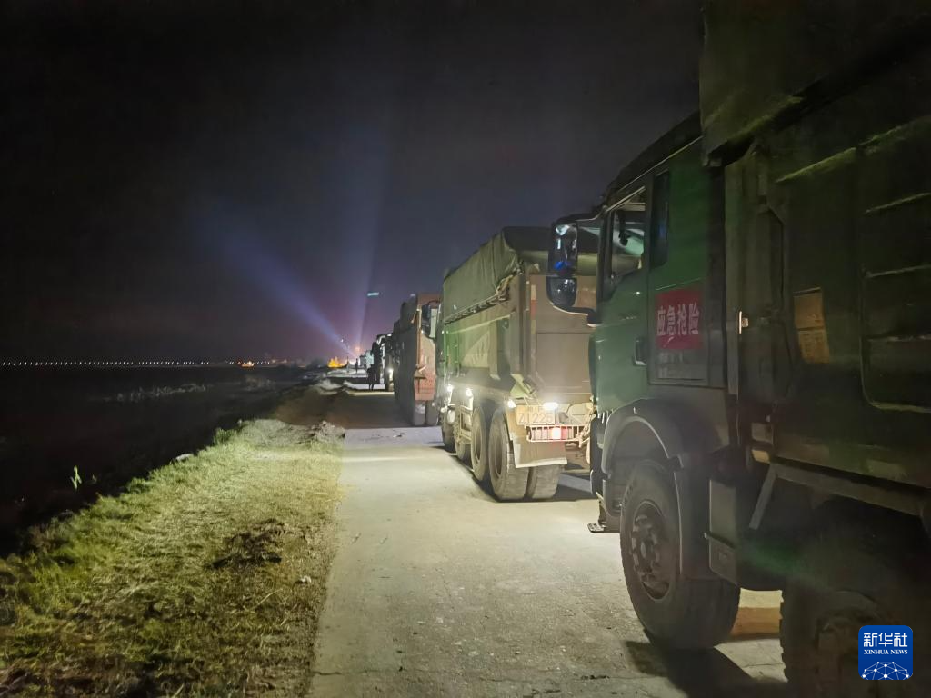 時間指向凌晨4點,通向決口的公路上,滿載石料的卡車、工程車輛仍然排著“長龍”,蜿蜒3公里長,機(jī)械的轟鳴聲響徹大堤。