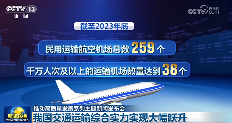 五年來,客貨運輸不斷發(fā)展,群眾出行更加舒適便捷,貨物運輸更加順暢高效。截至2023年底,我國鐵路營業(yè)里程15.9萬公里,其中高鐵營業(yè)里程4.5萬公里;全國公路里程543.68萬公里,其中高速公路里程18.36萬公里;民用運輸航空機場總數(shù)259個,千萬人次及以上的運輸機場數(shù)量達到38個。