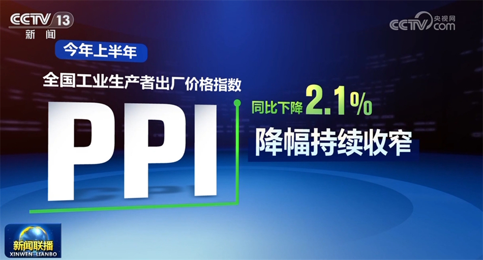 上半年,全國工業(yè)生產(chǎn)者出廠價格指數(shù)PPI降幅持續(xù)收窄,同比下降2.1%。