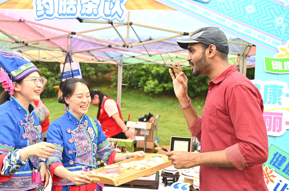 2024年4月11日,一名外國游客在“廣西三月三·八桂嘉年華”活動廣西南寧市青秀山主會場品嘗美食后做出“OK”手勢。新華社記者周華攝