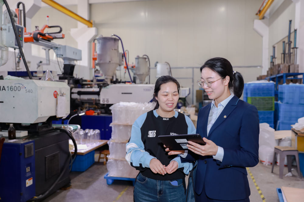 2023年11月,臺州銀行信貸經(jīng)理(右)在黃巖走訪小微企業(yè)。新華社發(fā)