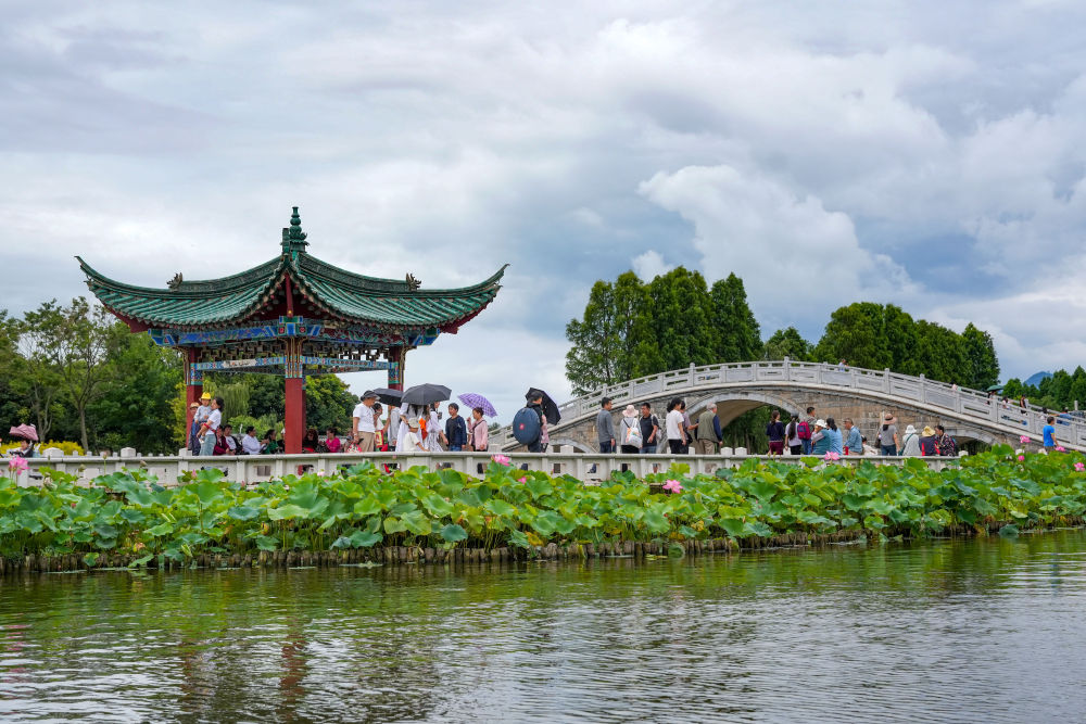 7月13日,游客在昆明市大觀公園內觀賞荷花。新華社發(fā)(郝亞鑫攝)